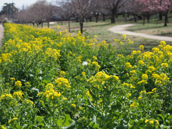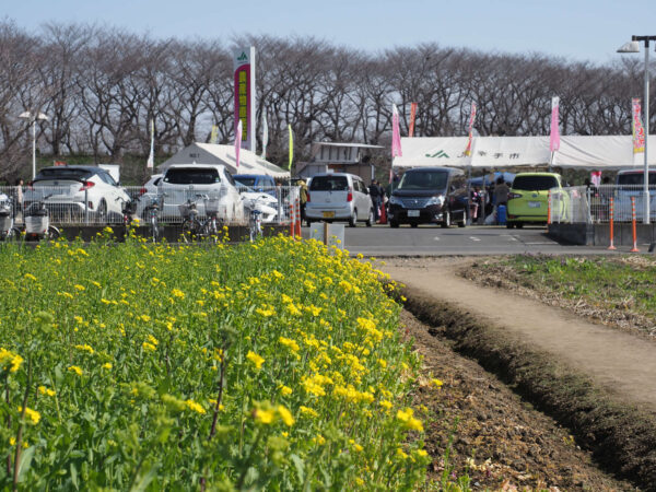 菜の花が咲いています。何か催し物をやっているようで、大きな声が聞こえ、多くの人が集まっていました。
