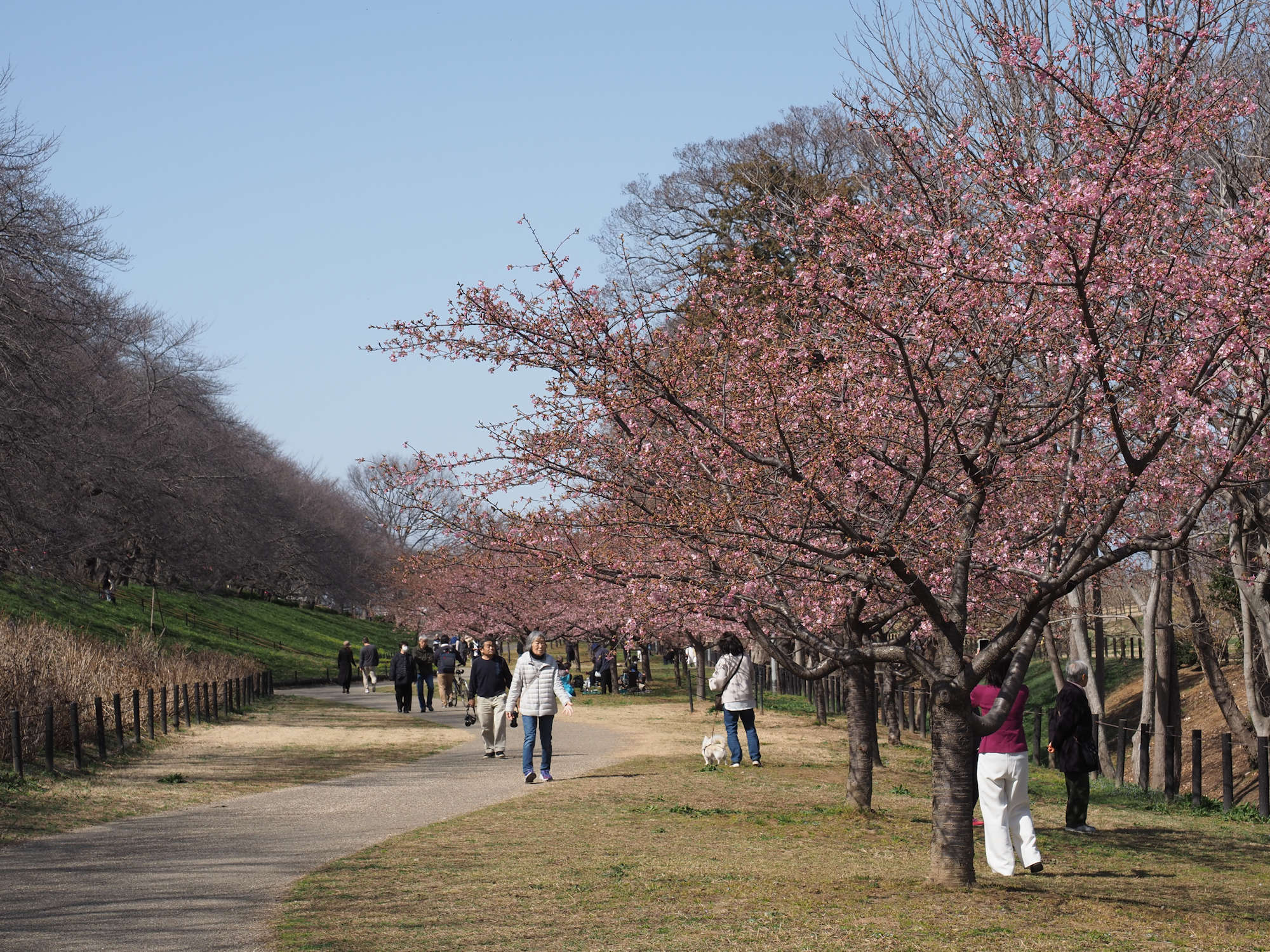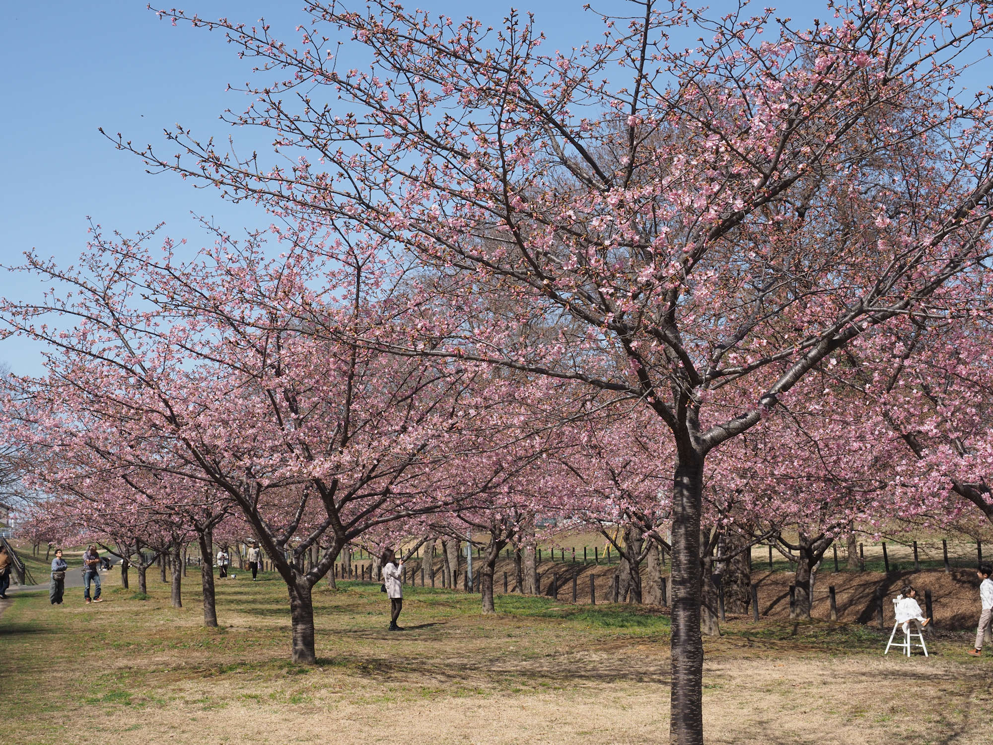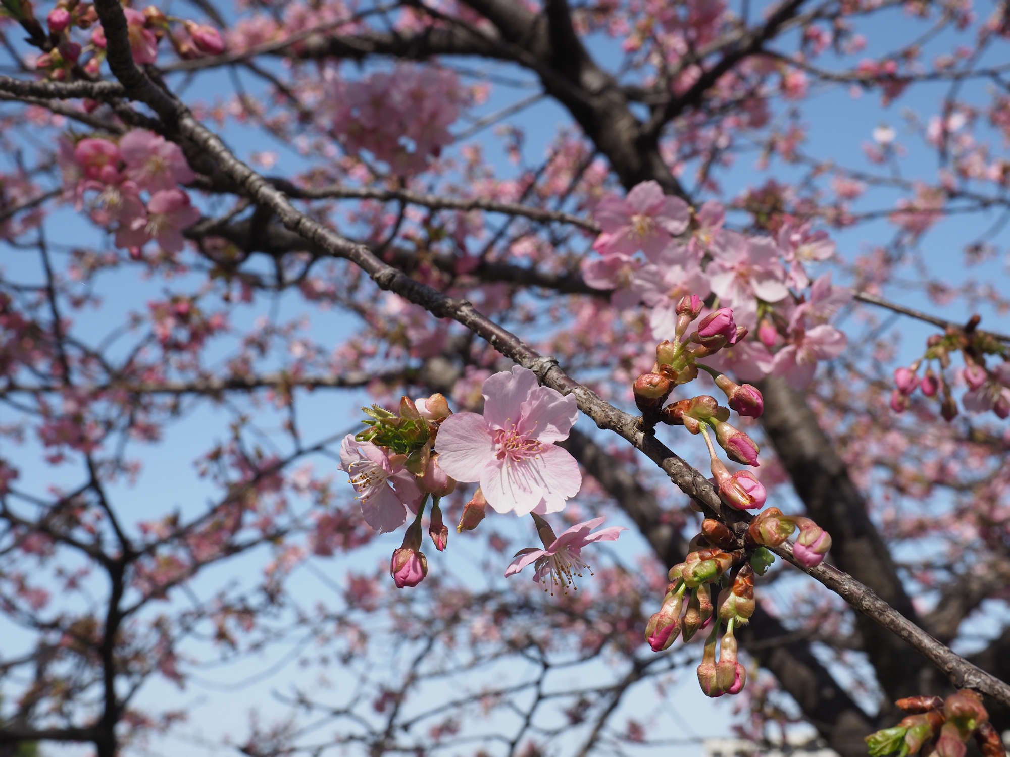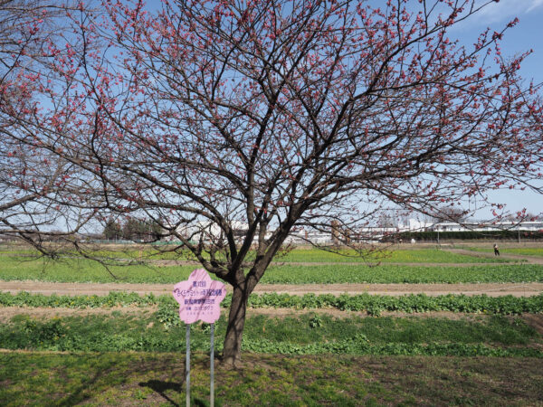 堤ではなく、中川に沿って、まだ満開ではありませんが河津桜が咲いていました。